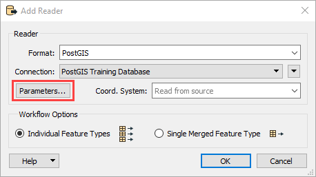 - 接下来,从读模块连接列表中选择PostGIS Training Database。如果尚未设置数据库连接,请选择“添加数据库连接”并输入以下参数: