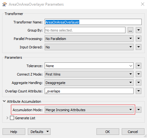 - 将Attribute Accumulation Mode设置为Merge Incoming Attributes(合并进入的属性)。这将允许您连接要素重叠的HistoricZones和Neighborhood多边形两者的属性。