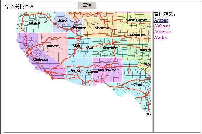 7.这样查询功能就完成了,运行然后输入“A”查询地图中STATE_NAME以A为开始的地理元素。