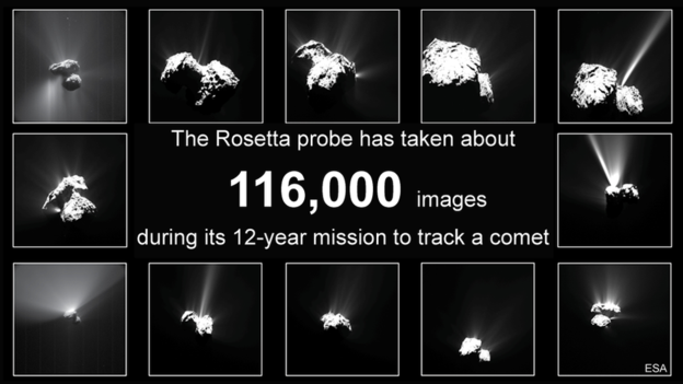 罗塞塔号向地球传回的最后一张照片,当时飞行高度只有51米,能够看清彗星表面的小石块。 罗塞塔号撞击67P彗星后长眠在这颗4公里大小的彗星上,与菲莱完成了团聚。在着陆前最后时刻,罗塞塔号持续向地面发回67P彗星的探测数据,并传回了数张高分辨率图像。 19时19分,当罗塞塔号发回的信号消失时,控制中心只有微弱欢呼与简单握手祝贺,大家庆祝任务的终结,也对罗塞塔号的离去依依不舍。从上世纪90年代提出探测计划至今,一些在现场的科学家已在罗塞塔号项目上花费了三十年的心血。 欧空局任务经理帕特里克·马丁(Patrick Martin)说:“我终于可以宣布罗塞塔号向67P彗星的历史性着陆取得圆满成功。告别罗塞塔,它已经非常出色地完成了所有科学工作。” 罗塞塔号抵达67P彗星两年来所得到的科学数据,足够科学家忙碌数十年。