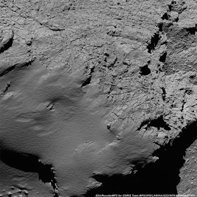 北京时间9月30日下午14点53分,罗塞塔号拍摄的67P彗星表面纹理特征对比照片,拍摄高度8.9公里。来源:ESA