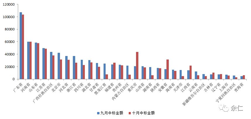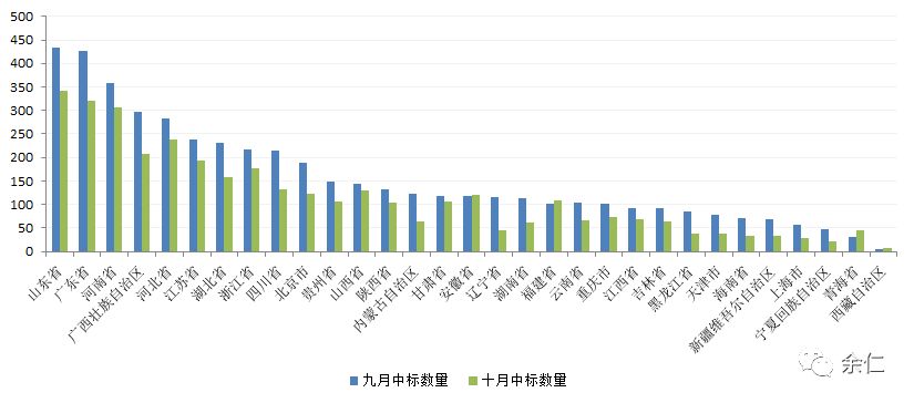 九、十月各省数量统计 由于十一长假,各省发布的项目数量基本比九月都要少。