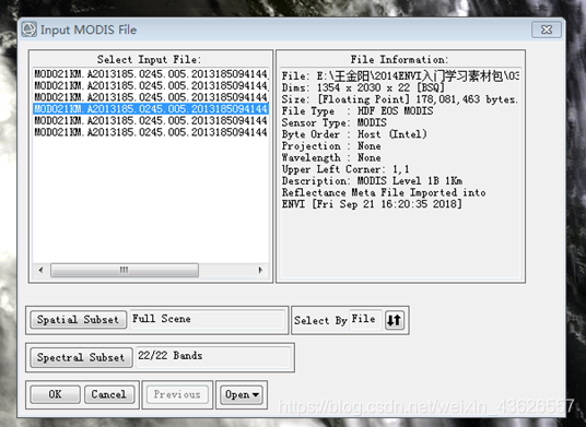 图2.2.1 选择文件 第三步:设置输出参数 (1) 在Select Out Projection对话框中,设置输出文件的投影参数。选择Geographic Lat/Lon坐标类型,Rotate and Transpose if Descending:No(该数据为升轨),单击OK打开Registration Parameters对话框如图2.2.2。