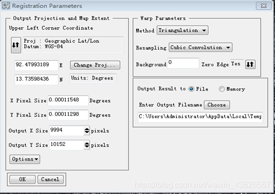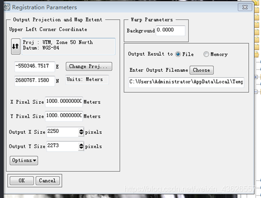 图2.1.5 校正配置 如下图2.1.6为校正结果,由于选择的是UTM坐标系,两边有一定范围的裁剪,如果要得到完整的图像,可以在Registration Parameters面板中手动将输出列大小交换机OutputX Size数字设置大一些。