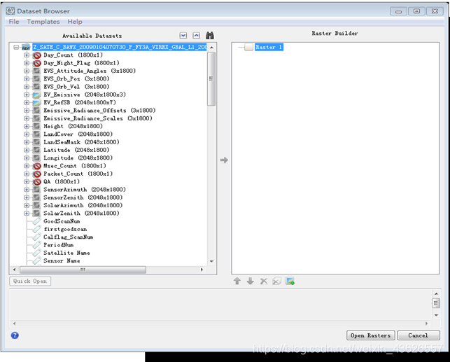 图2.2.4 在Google Earth中显示结果 2.2.3 基于GLT方法的国产卫星影像几何校正GLT几何校正法利用输入的几何文件生成一个地理位置查找表文件(geographic lookup table,GLT),从该文件中可以了解到某个初始像元在最终输出结果中实际的地理位置。地理位置查找表文件是一个二维图像文件,文件中所包含两个波段:地理校正影像的行和列,文件对应的灰度值表示原始影像每个像素对应的地理位置坐标信息,用有符号整型储存,它的符号说明输出像元是对应于真实的输入像元,是由邻近像元生成的填实像元(infill pixel)。符号为正时说明使用了真实的像元位置值;符号为负时说明使用了邻近像元的位置值,值为0说明周围7个象元内没有邻近像元位置值。GLT文件包含初始影像每个像元的地理定位信息,它的校正精度很高。避免了通过地面控制点利用二次多项式几何校正法对低分辨率影像数据的处理。 第一步:打开数据文件 (1) File > Open,选择文件后缀是.he5的文件,进入Select HDF5 Datasets面板,如下图所示。 注:风云三号卫星影像是以HDF5格式储存,但是后缀名还是.hdf,因此手动改成.he5。 (2) 文件中包含很多信息,选择图像数据EV_RefSB,点击中间的加载箭头,将所选数据加载到右边的列表中,单击右下角Open Rasters,打开图像。 (3) 相同方法,同时将定位文件(Latitude和Longitude)打开。如图2.2.5