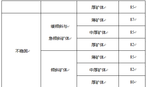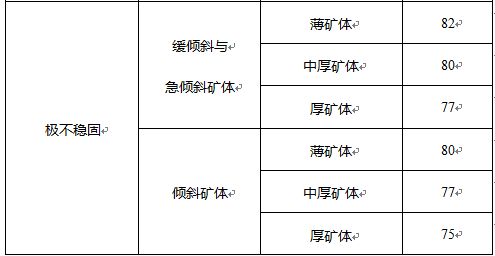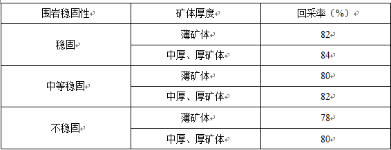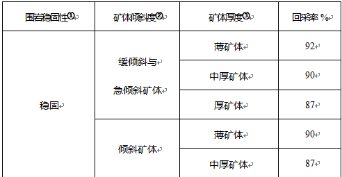 注:(1)岩稳固性划分为稳固(Ⅰ、Ⅱ级)、中等稳固(Ⅲ级)、不稳固(Ⅳ、Ⅴ级)三类。(2)矿体厚度依据矿体真厚度(H)划分为薄矿体(H≤0.8m)、中厚矿体(0.8m<H≤4)和厚矿体(H>4m)三类。