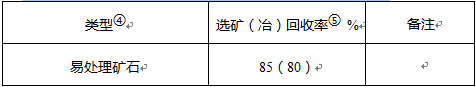 注:②矿石中等可选是指矿石的物质组成、结构、有价成分的赋存状态使其在常规选矿方法、选矿条件和选矿流程中较容易分选并得到理想指标。 ③矿石复杂难选是指矿石赋存状态微细(小于10微米)呈浸染状嵌布,或者共伴生组分多,或者泥化严重,或者氧化率>30%,或者以上条件兼而有之。