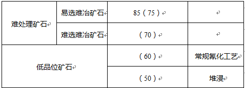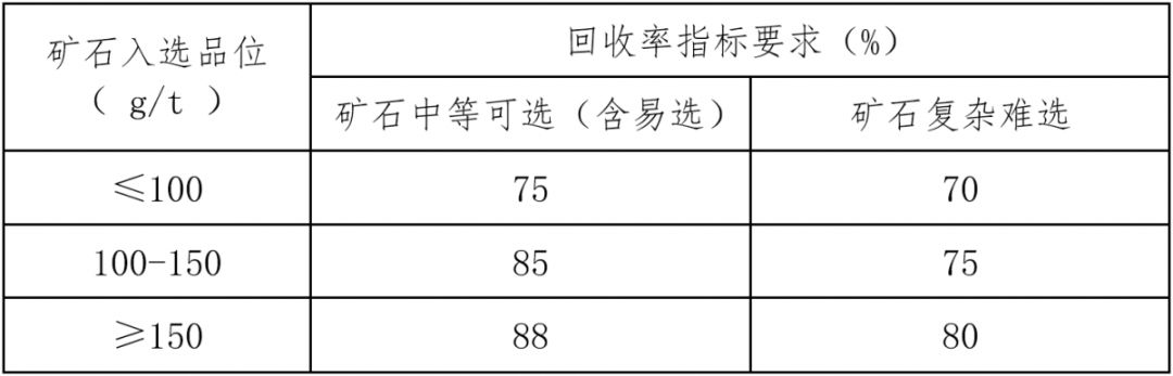 根据金矿加工处理的难易程度不同,黄金矿山企业的选(冶)回收率应达到以下指标要求(详见表2)。