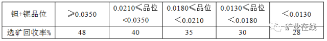 2、选矿回收率 根据矿石品位不同,铌钽矿选矿回收率最低指标要求分别为28%-48%(详见下表)。