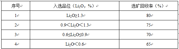 2.选矿回收率 在保证生产合格锂精矿产品的基础上,根据矿石结构构造类型、矿石入选品位等影响因素,锂矿选矿回收率应分别达到以下指标要求。