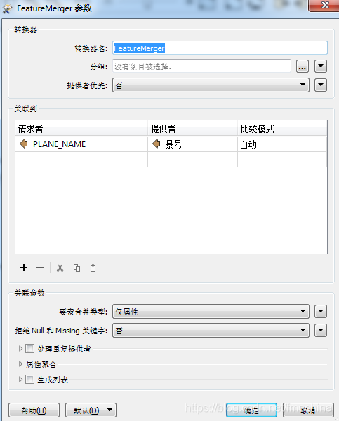 图10 镶嵌块属性挂接整合模板 涉及的转换器及其功能介绍如下: 1)FeatureMerger转换器:根据原始镶嵌块文件的PLANE_NAME字段和生成的落图文件中的景号字段进行属性挂接,得到带有原始卫星数据信息的镶嵌块shp文件;