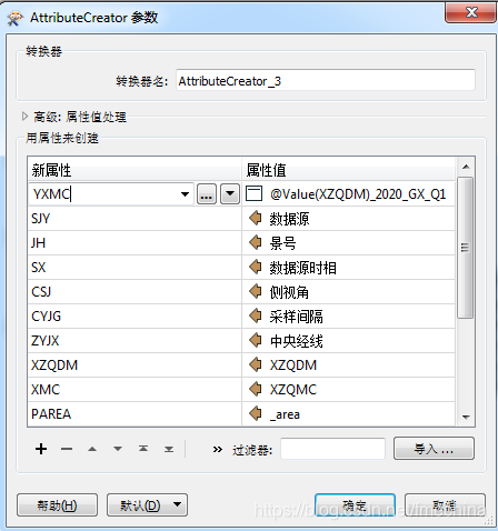 图7 原始卫星影像属性创建 (5)生成遥感影像落图文件:通过上述操作可以实现一个xml文件到一个shp落图文件的转换,再通过FME批量转换的功能,将指定文件夹下所有的xml文件生成所有的shp落图文件。 此外,考虑到不同卫星数据源的xml文件节点不同,因而其解析方式存在一定差异。上述模板主要是针对高分系列的卫星,其他卫星如北京二号的解析节点是Metadata_Document,需要创建新的模板进行解析(仅需对节点属性的选择和AttributeCreator转换器的赋值进行针对性修改即可)。最后通过动态模式将单个shp落图文件合并成一个总的shp落图文件。