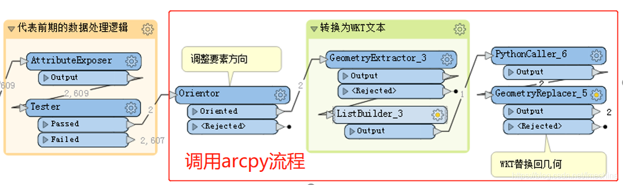 整个流程就是: 先提取数据WKT数据,然后利用arcpy.FromWKT(),将转换成为几何对象;利用arcpy.Geometry()方法,将几何对象去作为arcpy的参数参与运算;最后再用GeometryReplacer将WKT形式地运算结果替换回来即可。 这个方法可以在FME处理流程中的任意位置,数据利用arcpy进行处理,处理后的结果同时也返回在FME中,可以向使用普通的转换器一样使用它,而不需要再单独读写中间临时数据。 需要注意的是,一由于中间的处理流程,丢失了数据的属性,最终的计算结果,并没有保留下来属性,和直接用诸如AreaOnAreaOverlayer此类的转换器还是有区别的;二是,由于转WKT的格式限制,弧会被打散成折线,椭圆会被打散成多边形(虽然在这一过程中会自动进行节点增密),但还是不可避免地造成精度的损失。 受以上两个因素的影响,能够真正运用到实际处理过程中的应用情景,还是很小。也比不上FME自带的转换器方便。不过在小规模数据,精度要求不高的场景下,还是比较方便的。 本文转载来自CSDN作者:fmechina 版权归作者所有