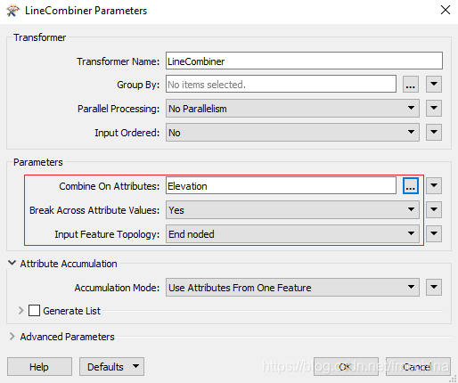 7.设置组合属性 这个转换器的目的是组合路径,使每个路径ID都有一个记录而不是分段的等高线。 - 打开LineCombiner参数。