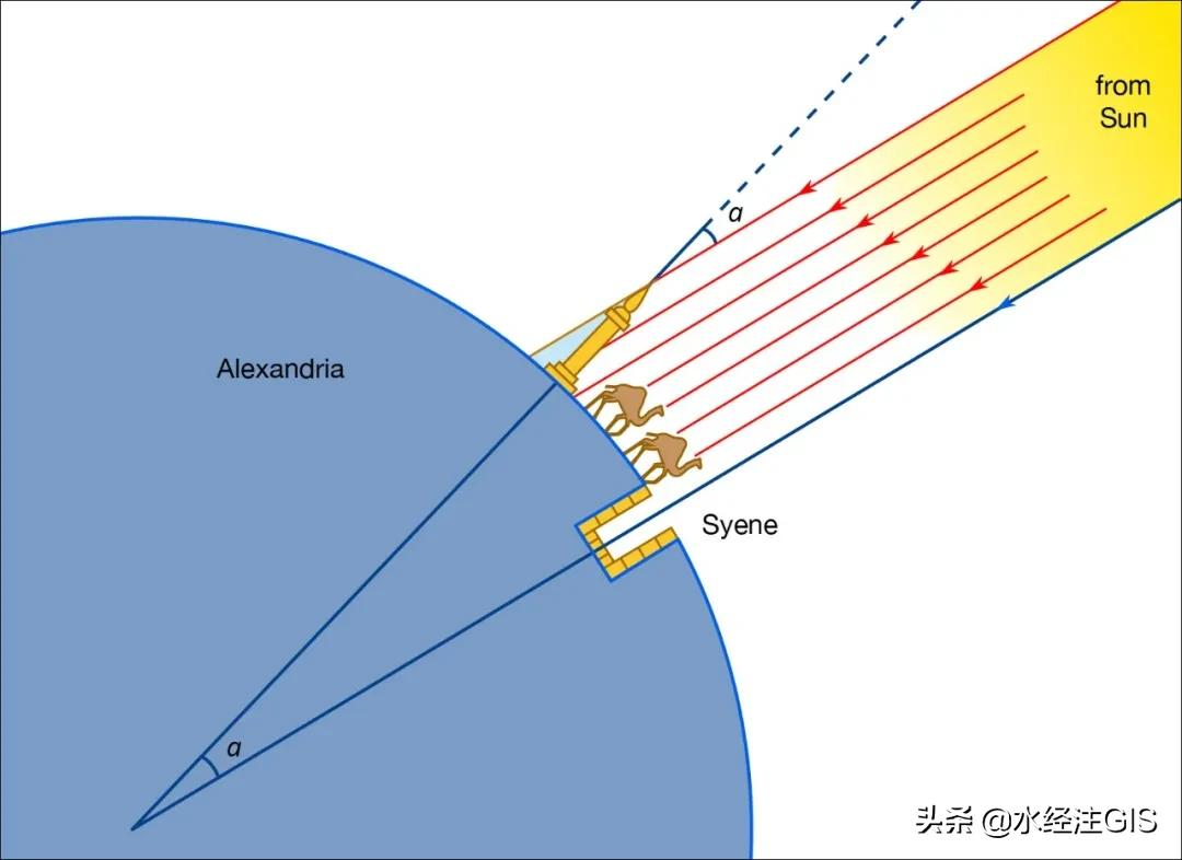 埃拉托色尼比较长寿,达82岁高龄,如果他生在中国将会经历战国后期,亲眼见证秦统一六国、灭亡和西汉的建立,虽然他比刘邦大19岁,却在刘邦去世约两年之后才去世! 约公元前240年,也就是埃拉托色尼35岁,刘邦16岁这年,他根据亚历山大港与Syene(埃及的阿斯旺)之间不同的正午时分的太阳高线及三角学计算出地球的直径。 这个时候,地球是个球体对埃拉托色尼来说应该已经是个常识了,而中国古人还认为是“天圆地方”,直到东汉张衡(公元78年-139年)才提出:“浑天如鸡子,天体圆如弹丸,地如鸡中黄,孤居于内,天大而地小。” 也有人说张衡并没有意识到地球是圆的,而仅仅认为天像鸡蛋一样是圆的,但包住的这片大地是平的,且是漂在水上的,这是基于张衡著作的另一种解读。 03古人如何证明地球是球形?地球是球形,这不是埃拉托色尼发现的,早在埃拉托色尼几百年前的毕达哥拉斯就提出地球是球形了。 不过毕达哥拉斯似乎没有证明,只是纯粹的想象,因为按照他的思想,地球应该是一个最完美的几何体——球形。 此外,似乎德谟克利特和柏拉图都作出过地球是球形的判断,柏拉图的学生欧多克斯提出地心说,而地心说必然是以地球为球形为前提的。 第一个证明了地球为球形的人,是亚里士多德,他给出了三个有力的证据。 1) 越向北走,北极星的高度就越高,越向南走,就越低。 2) 月食是地球的影子遮住了月亮,那么看看落在月球上的那个影子,总是一段圆弧。 3) 海面上,当一艘船从远方向岸边驶来时,岸上的人总是先看见桅杆,然后看见船身;而当驶离时,正好相反,船身先在海平面处消失,然后才是桅杆。 以上几个现象就证明了,我们所处的大地是一个球形。 埃拉托色尼比亚里士多德(公元前384~前322)晚出生一百多年, 因此当时对他来讲地球是球形应该已经是个常识了。 04地球半径推算原理人类的求知欲促使人类不断去探索,当人们意识到地球是个球体时,就更希望了解到球体有多大。 在赛伊尼(今埃及阿斯旺附近)有一口井,埃拉托色尼发现每到夏至日的时候太阳光就会直射井底,但是在亚历山大城地面上,一座尖塔却有一段很短的影子。 我们在水经微图中大概找出了阿斯旺和亚力山大的大致位置位置,肯定与1700多年前埃拉托色尼说的位置多少会有些出入,如下图所示。  阿斯旺与亚力山大
