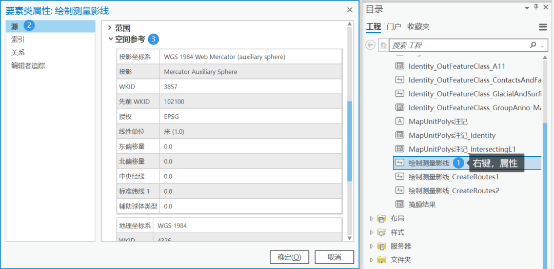 方法一:在目录窗口中,数据属性中查看。 方法二:在内容列表中,图层属性中查看。