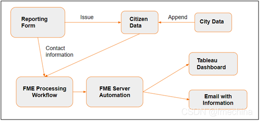 ——使用商业智能软件和 FME 数据集成创建自动化生成公民报告应用程序的分步指南。 想象一下:这是市政厅繁忙的一天,电话铃每两分钟响一次。社区居民打电话来报告他们所在社区附近的问题。有些人已经等待30分钟,准备挂断电话。这是我们就会想,如果有无限的员工来回应每一个问题并保留记录就完美了。 有一个更简单的解决办法。使用FME,您可以将在线公民报告表单与商业智能工具(BI)集成在一起,以便在请求传入时自动跟踪请求。商业智能工具对于为大量数据快速创建报告并公开共享它们非常有用。它们还创造了一种快速、简单的方式来可视化。利用FME可以对采集到的数据进行自动处理和更新。 FME Desktop支持450+格式和应用程序,可帮助您准确地根据您的需要集成和转换数据。 面对大量的请求,人工很难处理所有的数据,使用FME,您可以创建复杂的预处理工作流,并通过FME Server实现自动化的完成所有的工作。因此,您可以让它在后台运行,自己专注于其他重要的工作。没有电话会突然打断您的工作。 我们将使用失物招领宠物报告模型作为示例。