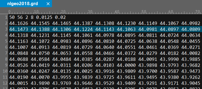 其中头文件也就是第一行记录的坐标信息,和格网间距信息 下面的文件主体为各个节点的高程值 模板结构 下面简单说明如何从自己的格网转换为EGM96GRD格式。 首先模板将Ascii格网文件转换成经纬度格式,我手中的格网文件不是密集点云数据,是间隔百米的高程异常文件,首先将其生成DEM通过内插将数据加密,然后提出内插后的高程做为一个点云,然后转换为一个光栅格网用于后续转换。