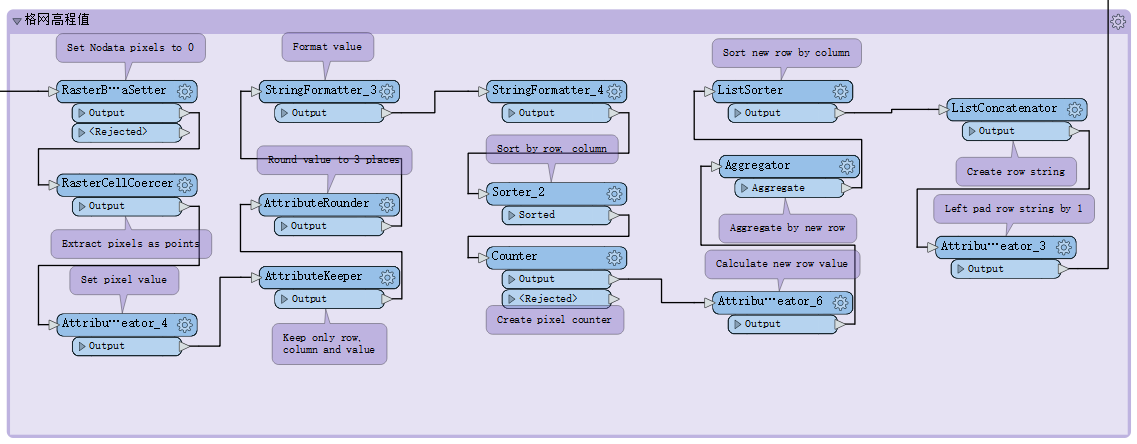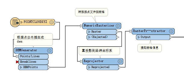 这个过程需要您提供格网像素间距,它应等于或大于点云的点间距。如果点不在椭球投影中,请再添加一个CsmapReprojector转换器,以便在光栅化之前重新投影点云文件。 然后,根据EGM96 Ascii GRD的格式,重新构造文件结构头文件和主体部分
