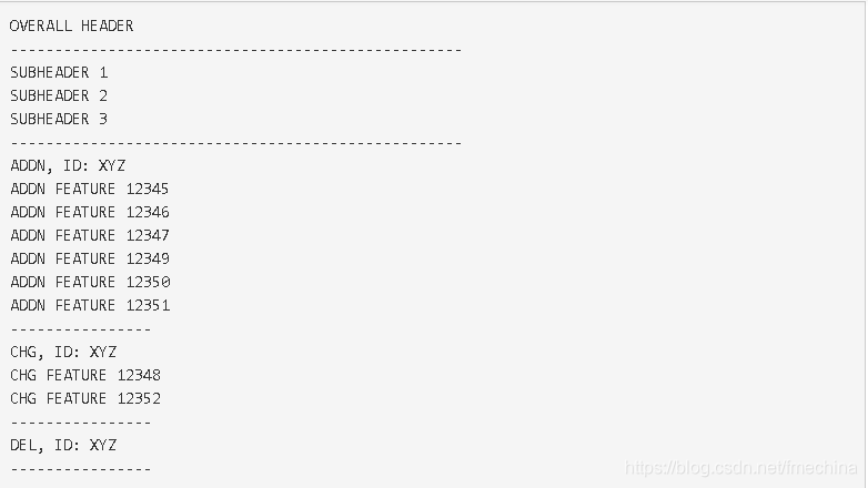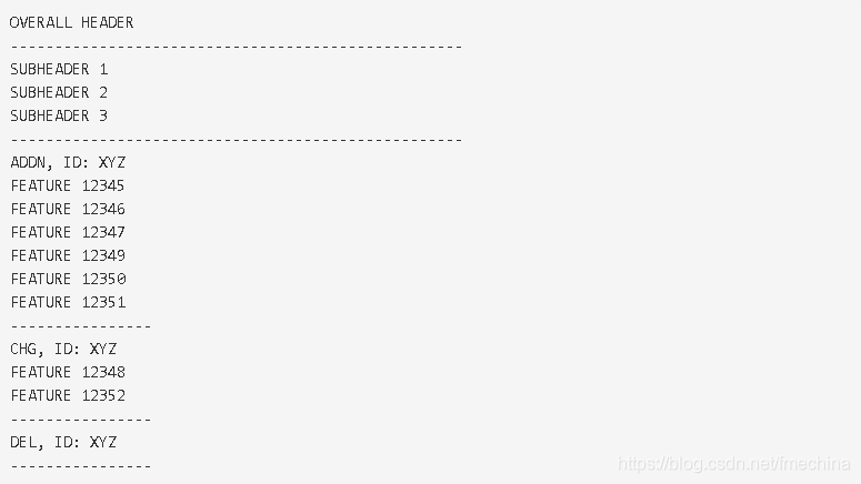 它本质上是一个要处理要素列表的日志。添加要素(ADDN),更改要素(CHG),删除要素(DEL)。使用FME文本行读模块读本文,从标题和分隔符行中提取要素并不困难。 难点是在如何表达:FEATURE 12345是ADDN,因为“ADDN”部分是在标题中定义的(我们称之为Action Header)并且只是单独读取一个要素且不包括Action Header内容。 此外,文本结构不固定。文本可能并不总是恰好添加6个要素,或者并不删除任何要素。所以我们不能用定义行数、或文件结构的方法读取数据。 在此之前,有一种解决方案是使用VariableSetter和VariableRetriever转换器。 将Action Header保存为变量并应用于所有后续要素。但至少对我来说 ,这不是处理这些数据的最佳方式。使用这样的变量需要工作空间中的要素流是可预测的,我更喜欢确定性而不是预测! 因此,我提出了使用相邻要素属性的解决方案。