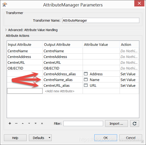 2.更改别名值 AttributeManager转换器用于访问在步骤1中暴露的<name> _alias属性,并为数据属性别名分配新值。 在AttributeManager转换器的属性中,只需在“Output Attribute”下输入要更改的<name> _alias属性,然后将“Attribute Value”设置为包含要写入目标别名定义的更改后的新值。