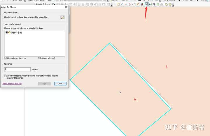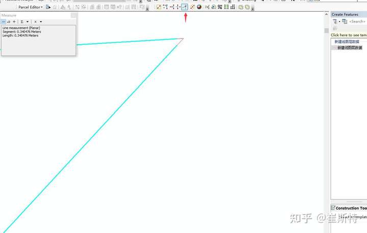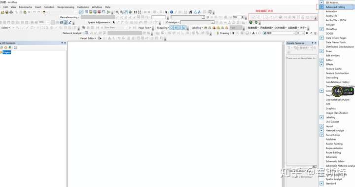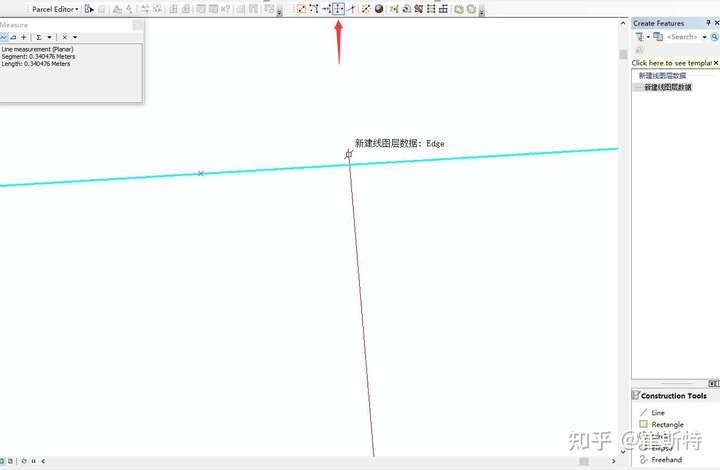 首先在菜单栏空白处右键,把Advanced Editing勾上,把高级工具条的调出。  高级工具条从左到右依次是 copy features tool 复制工具 fillet tool 圆弧工具 extent tool 延伸工具 trim tool 裁剪工具 line intersection 使线相交工具 explode multi-part feature 炸开(打散)多要素工具 construct geodetic 创建大地测量要素工具 align to shape 使图形贴近 replace geometry tool 更换几何图形 construct polygons 构造面 split polygons 切割面 planarize lines 打断相交线 generalize 抽稀处理工具 smooth 光滑处理工具 copy features tool 复制工具的使用,开启编辑状态,选中一个图形,点击copy features tool工具,然后任意点击一个地方,就会将这个图形复制到该处。如图所示  fillet tool 圆弧工具的使用,针对线型图层,选中需要在中间插入圆弧线的两条线段,然后点击圆弧工具,移动鼠标调节圆弧的幅度,如图  extent tool 延伸工具的使用,针对线型图层,选中需要延伸到它那里的这条线段,然后点击延伸工具,再点击需要延伸的线段,如图  trim tool 裁剪工具的使用,针对线型图层,选中需要裁剪到它那里的这条线段,然后点击裁剪工具,再点击需要裁剪的线段一端,如图  line intersection使不想交的线相交工具的使用,针对线型图层,选中需要相交的两条线段,然后点击相交工具,依次点击需要相交的线段,然后再点击任意一个地方结束,如图  explode multi-part feature 炸开(打散)多要素工具的使用,即选中需要打散的多部件要素,然后点击打散工具,即可从多部件变成单个要素。 align to shape 使图形贴近工具的使用,用来修复缝隙,或者让两个图形贴在一起。 选中需要靠边的图形 点击贴边按钮 沿着边界描边,然后设置距离容差